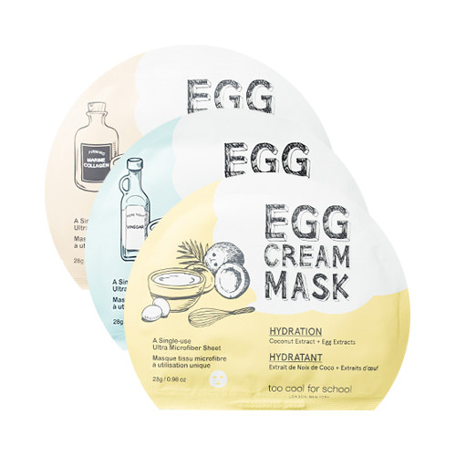 Too Cool for School Egg Cream Mask Тканинна маска трьох видів, основним компонентом яких є яєчний екстракт, поліпшує еластичності і активно живить шкіру.